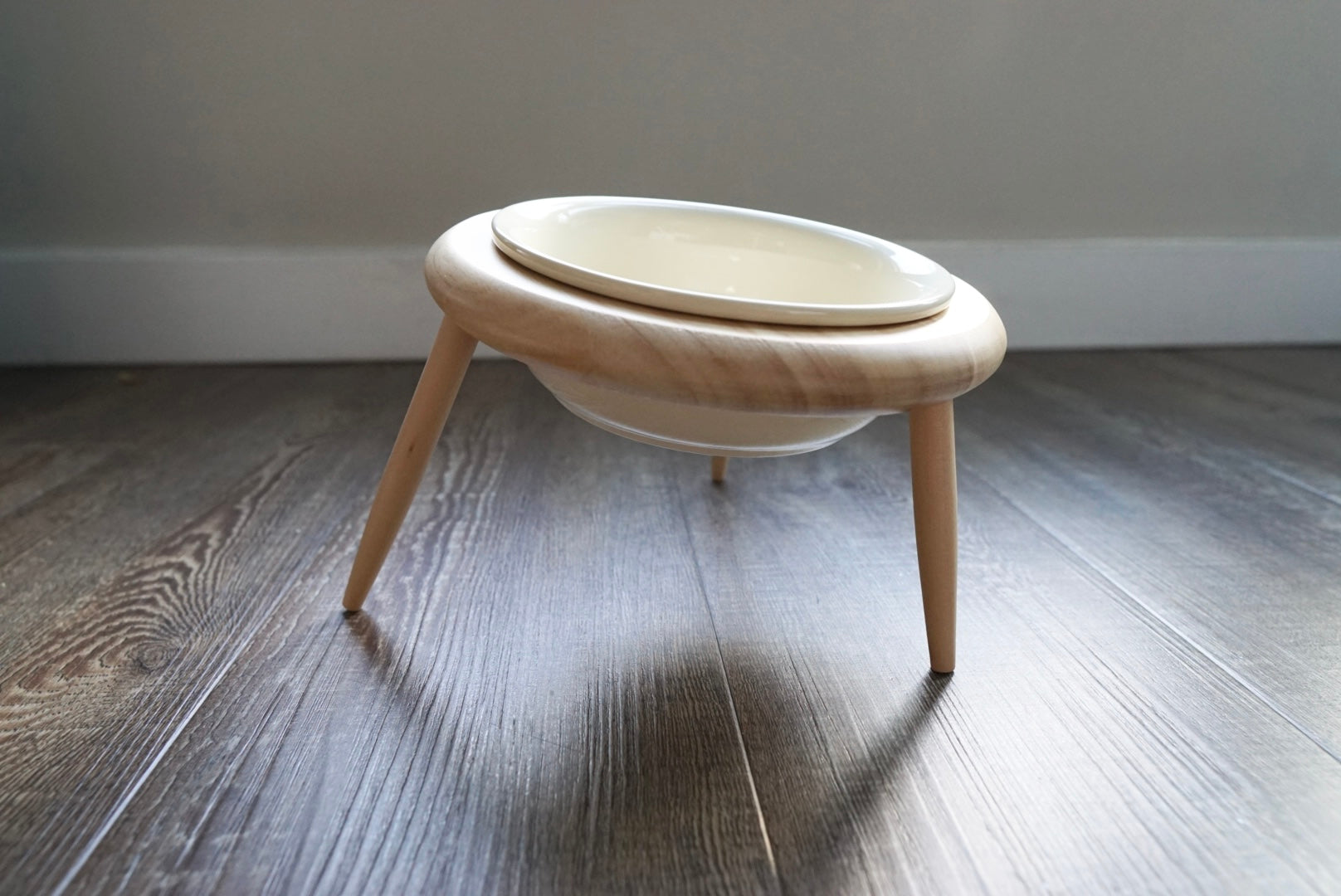 Elevated Ceramic Pet Bowl Wooden Stand – Beige Bowl + Stand with Two-Way Tilt Function/ Water Bowl/ Raised Bowl